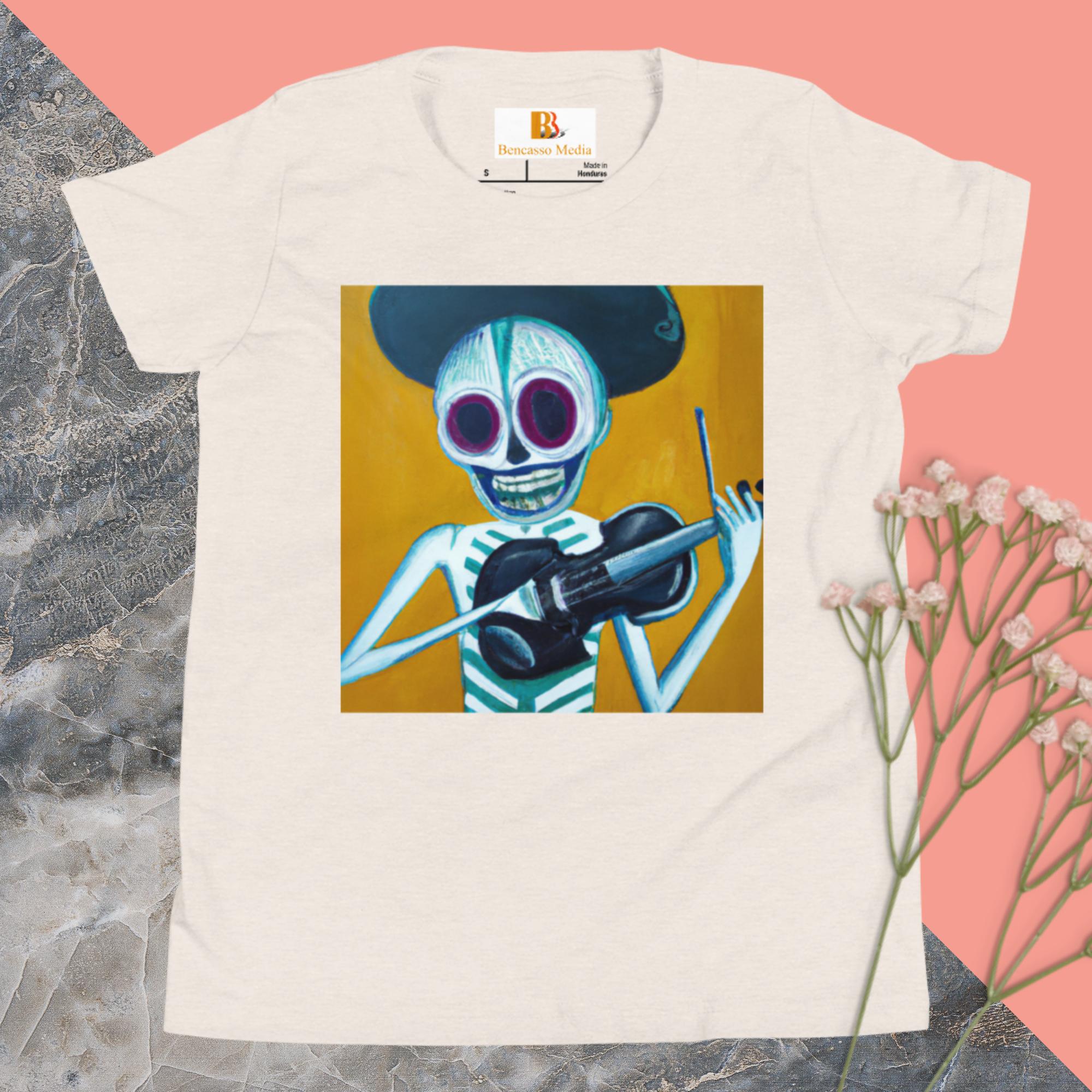 Skeletonichi Strumming Violin Day of the Dead Halloween Youth Short Sleeve T-Shirt - Image 5